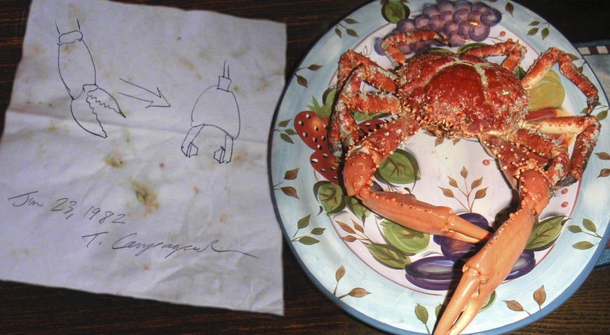 There has been some spirited discussion as to whether the Delta brake predates the 1983 cutoff and is thereby on-topic discussion according to the rules of the Classic Rendezvous Vintage Bike Mailing List. Here it is, incontrovertible proof that the Campagnolo Delta brake's design originated before 1983. This photo, taken after lunch in a small seafood restaurant in Vicenza, shows the very first Delta brake sketch on a butter-soaked napkin. Done in haste at the moment of inspiration, the drawing unfortunately no longer exists (having been disposed of by an over-eager busboy). But the photo is evidence enough and should put the matter to rest once and for all... the Delta brake falls within the CR timeline. |