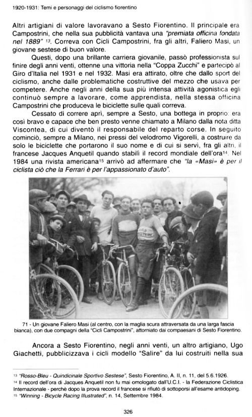 Other valid craftsmen worked in Sesto Fiorentino. The main one was Campostrini, who in his advertising boasted an "award-winning workshop founded in the 1889." Faliero Masi, a good youngster from Sesto, raced with others on Campostrini bicycles. Masi, after a brilliant career among the juniors, turned professional towards the end of the twenties, obtained a victory in the "Zucchi Cup" and participated in the Giro d' Italia in both 1931 and 1932. Masi was attracted, not only by the sport of cycling, but also by the construction problems of the tool used by the cyclists when they competed, namely his bike. Even during the years of his most intense racing activity, he continued to work, as an apprentice, in the same Campostrini workshop that produced the bicycles upon which he raced. Once he stopped racing, he opened, still in Sesto Fiorentino, a shop of his own: he was so good and capable that he soon [was] called to Milan by the famous company Viscontea, where he was put in charge of the racing division. Later on, he began, [also] in Milan, near the Vigorelli Velodrome, to build on his own the bicycles that carried his name and which were used, among others, by the Frenchman Jacques Anquetil when he set his world hour record. In 1984, an American magazine even went so far as to assert that "Masi is to cyclists what Ferarri is to car fans." Caption: A young Faliero Masi (in the center, with the dark jersey with the wide white band), with two teammates from "Cicli Campostrini" surrounded by fellow citizens of Sesto Fiorentino.