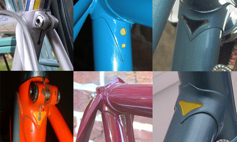 The transition from pressed lugs seems to have occurred over a period of perhaps 50 frames. The earliest example on the Registry with investment cast lugs is #0115, while pressed examples continue to appear sporadically to at least #0157. The easiest way to tell the difference between the two sets is to look at the seat lug. The pressed lug frames had a plain slot in back under the binder bolt ears, while the IC lugs had a triangular cutout over a shorter slot. On the seat tube tang, the IC lugs were plain while the pressed lugs had two small holes in a longer tang . You can see a difference in the lower head lug as well, though it is more subtle. On the pressed lug, the upper edge of the cutout has a pronounced curve while the IC lug's line was straighter. |