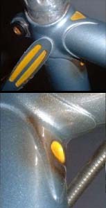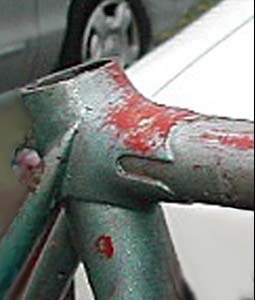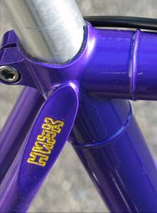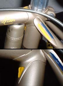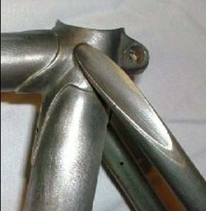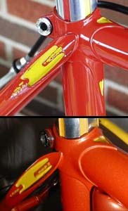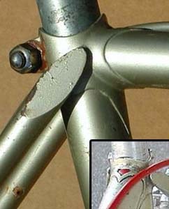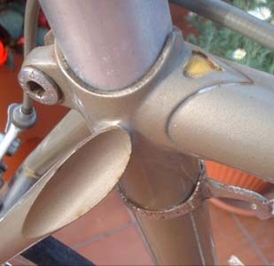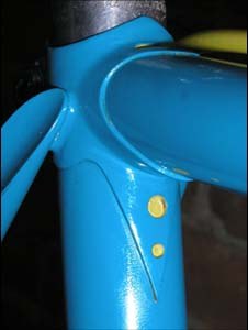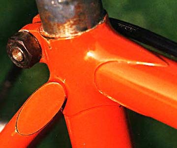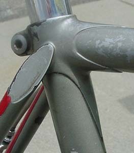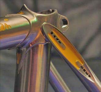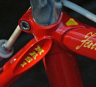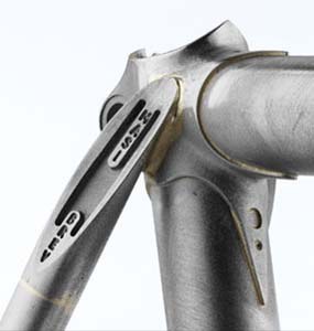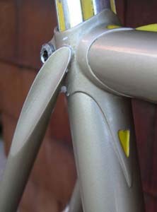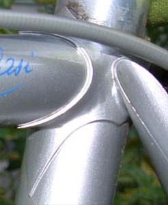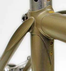 Lug manufacturer unknown. Unusual seat stay treatment (for Masi). | This was to become the standard Masi "look" for many years... flat beveled stays, cast Cinelli long-point lugs. Here, the stay attachment was quite low... | ... but it would migrate upward over the coming years. Hard to see, but Faliero had added his now trademark long seat tube tang which is missing on the previous example. | Some "Nervex Masis" had this pointed semi-wrap-around stay... | ...while others had the Masi standard beveled stay. | Faliero then returned to the Cinelli lugs and his traditional look... | ... though the bevel and contour of the stay as well as its attachment point varied somewhat. So did the length of the seat tube tang (which at times was quite long, as in this spectacular example). | In 1967, Faliero switched to Nervex Dubois lugs which had shorter tangs. This was also the introduction of the cutout, a unique shape that was a cross between a heart and a triangle. This was to be a signature Masi 'look' for decades. | The look remained unchanged on the first Gran Criteriums... | ... until the introduction of the famous 'fluted' stay in the spring of 1971. Like the flat stays, these were done by hand. After sawing the stay at an angle and relieving the open end with a curved file... | ... a curved piece of frame tubing (or fork blade) was brazed into the depression and filed flush with the stay, as can be seen in this unpainted example. There was quite a bit of variation in these stays (the angle of the bevel, the crispness of the flute edges, and the contour of the upper end). | Sometime around the end of 1971, two holes began to appear in the seat tube tang. | In 1973, Masi production began in Carlsbad, CA. The look of the first frames was pretty much identical to the Milano bikes, but they soon began to diverge. Here is a Gran Criterium from 1974... | ... and here is a later example from 1976 with investment cast lugs. It should be noted that even though the cast lugs were supposed to eliminate a lot of finish work, in many cases builders still altered them significantly for design purposes. In this example, notice the unusual point in the seat tube shoreline (right below the seat stay). Note that by 1976, the two holes had disappeared form the seat tube tang on US frames. | While in Italy, the two holes gave way to a smaller version of the heart cutout. | Here is a 'short tang' example. Note also the engraved stay ends. Unlike the earlier stay ends, these were cast plugs that were brazed into the end of the tube (see the 2004 Nuovo Prestige for an unpainted example where the joint is visible). | Here is an early Prestige with the same slotted ends and a single hole in the seat tube tang. Both were very short-lived features | These cast seat stay plugs would remain in use for several decades... | ... though the "Brev Masi" text would change to "Masi Brev" ... | ... and there would be slight changes in the way the top ends were contoured, as in these two examples... | Meanwhile, back in the US, Masi continued to use the handmade fluted stays until 1985 when they began to use the Italian plugs. Note also the Italian brake bridge with the Italian curved sanserif typeface... | ...which made its way onto the seat stay plugs in 1987. Oddly, there is still no indication these were used on an Italian bike, where they would have been more appropriate. | In 1988, the US Masi got a plug with the slabserif typeface that they had been using on decals since 1973 (Italy switched to the rounded typeface in 1975). | Here is a different version with an open style typeface. | A return to a more traditional look. Richie-issimo lugs with two holes in the tang invoke the spirit of the early 70's, while the cast seat stay plugs continue a look that has been an Alberto trademark for 30 years. |