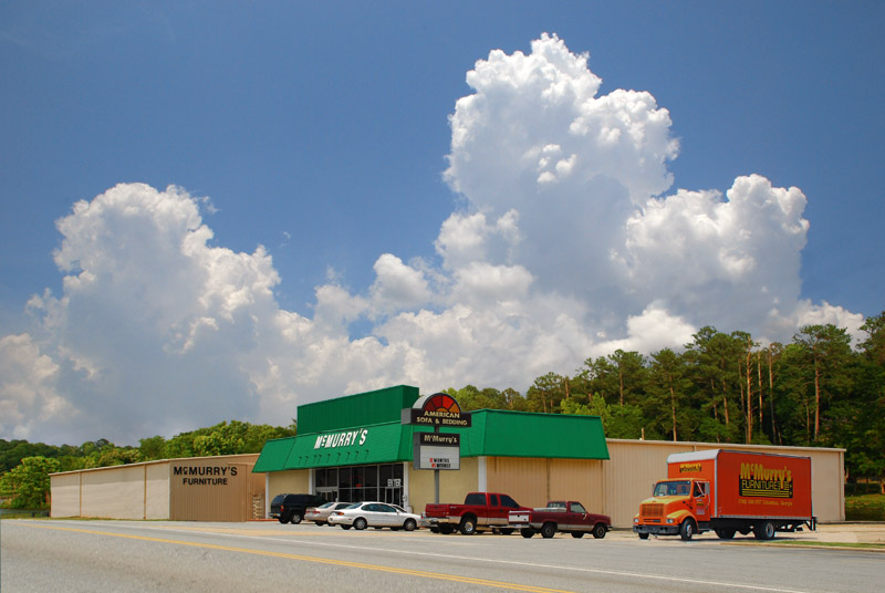 do in pinch. 29 June, 2007: Some of the photography I did with my old camera was work-related and I guess the new camera will be no different. Grabbing signage that the client does not have in electronic form, shooting product closeups, copying old photos that would take to long to scan, grabbing surface textures for backgrounds and 3D mapping are all uses to which I've put my digital camera. One of the biggies is shooting a storefront... clients often like to have a shot of their store at the end of the spot (even if they may be aware that it is not the most attractive shot) so that prospective customers will recognize it right away when they come to visit. If the storefront is clear and good looking, we usually shoot it on video when we are on site shooting interior footage. But sometimes I end up going back with my still camera for one reason or another. In the case of the shot below, there were too many power lines... these would have to come out in Photoshop and while I was at it, there were a few other changes that would be beneficial. First step was to choose a good image of the store itself, well exposed and with no cars going by on the street: The next step was to retouch out all the power lines and telephone poles that obscured the building and to take out a couple of cars. No single tool works best for this type of work. The clone stamp tool usually feels the best, but at other times it is faster and easier to select a source area and make a new layer of it, then move that layer into place over what you want to cover up. In any case, lining up patterns and compensating for lighting differences will be the biggest headaches, with the exception of having to scratch-build areas for which there is no clone source material. Here you may find yourself doing a lot of hand painting, or massaging adjacent areas into place with the smudge tool. The most important thing is to keep in mind the end use of the image... do not get bogged down on details that will not show or will be too small to register. I've kicked myself several times for spending unnecessary time repairing areas that would later be cut off, covered up or scaled down. Below are the before and after shots. The right hand image above also shows the next step or two... cutting the store and parking lot away from the sky and trees. In this case, cutting the store out was easy since it was mostly straight lines. I used the Polygonal Lasso tool which allows you to step from point to point, connecting each point with a straight line. Once the selection is closed, it can be cut or copied to a new layer or the selection can be used to create a layer mask (which will mask the layer non-destructively). If it had been a more complex solid shape, I probably would have used the pen tool to define a path with straight lines and curves, then create a selection from the path. If it had been a highly irregular and non-solid shape (like trees), I would have used a combination of magic wand, lasso and path to create a layer mask which I could then finesse with a brushes and other tools. I had decided to keep the trees to give another layer of separation between the store and the sky... but I had a problem with the trees in the original shot. There were not enough of them and the ones I had would have to be heavily retouched to get rid of the power lines. So I just ditched the trees entirely and substituted an uninterrupted line of trees from a nearby park: Next came the sky. I planned on moving the store from its original position in the middle of the frame to the bottom (a large expanse of sky would serve as the background for the client's logo), so I imported a different shot with the largest expanse of sky (something I'd shot for that very purpose on same day). After getting rid of a few power lines I made sure it was large enough to cover the area and then some. A large chunk of sky was important because it will be imported into the video editor on a separate layer so that it can track and scale independently, giving some added movement to the scene. Erasing a few trees from behind the store's facade (above) and adding a delivery truck (below, cut from an earlier photo) completed the image. Just for good measure, I grabbed a different sky shot a few days earlier on the other side of town. It never hurts to have more than one choice. After I had finished shooting the above shots, I found myself with some time to kill (I was on my lunch hour and I usually don't leave the TV station much so I was in no hurry to get back. Cooper Creek Park was right across the street so I wandered over to visit the mutant ducks. Yes, I know that's not their official name (I believe these are domestic versions of the Muscovy duck). These ducks have always creeped me out... I forgot who started calling them mutant ducks, it was either me or my daughter. These guys are about as tame as you can get. The visitors feed them and they are even in the habit of leaving the park grounds and raiding the dog food bowls at the nearby apartment complexes. These guys have got it made. Following these extremely docile ducks did not require much movement, I noticed that the usually shy dragonflies seemed to be tolerating my presence. I had tried shooting these guys before but they were always a bit too fast to get a reasonable shot from a close distance. Noticing that one dragonfly seemed to like to revisit the same twig, I inched closer and waited for him to come back. When he did, I had pre-focused on the twig and was ready for him. I used a similar technique to get the second one but it took several tries to get the shot I wanted. It's been a month now, so I guess this diary is officially over. I haven't had this much fun with a camera since I was a kid. And if any of you are wondering if I would favorably recommend a D-80 to someone considering moving up to an SLR, I would say yes, definitely. Though I must admit, I am not the flag-waving Nikon fanatic I once was... there